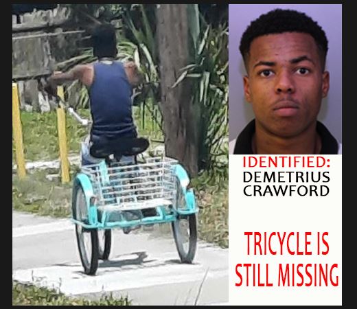 The suspect in this crime has been identified as 25-year old Demetrius Crawford, and he was charged with petit theft. The trike has not yet been located, so if anyone has any information about its location, please contact Detective Kelley at 863-499-2400 (Case #22-18465).