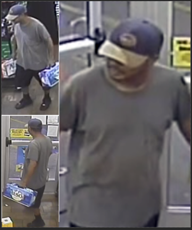 A store employee reported that this pictured man walked in the store and entered the beer cave. He walked out carrying an 18-pack of Busch beer, and an 18-pack of Natural Light. He then exited the store without paying for the beer.